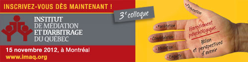 The Mediation and Aritration Institute of Quebec invites all professionals involved in conflict resolution/transformation in the workplace to attend this conference and try to get answers to these questions.